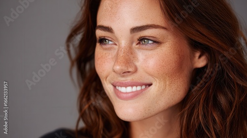 woman, smile, freckle, hair, portrait, closeup, beauty, confidence, emotion, lifestyle, happy, natural, skin, expression, cheerful, young, attractive, brunette, casual attire, relaxed, positive, friendly, genuine, glow, light, colours, style, fashion, youthful, vibrant, charming, radiant, face, eye, feature, soft, warmth, delicate, joy, serene, elegant, graceful