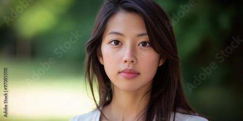 A close-up portrait of a young Asian woman wearing a casual t-shirt, with a blurred background.