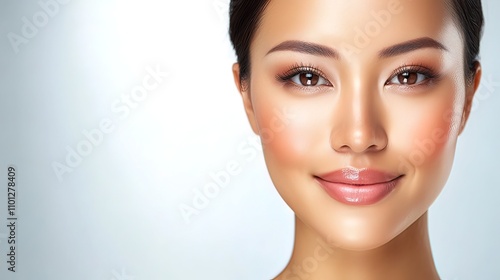 A close-up portrait of a young Asian woman with flawless skin and a warm smile.