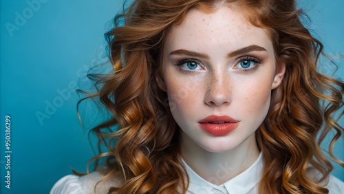A close-up portrait of a young woman with striking red hair, blue eyes, and freckles, exuding natural beauty and charm. Ideal for beauty, fashion, and natural themes.