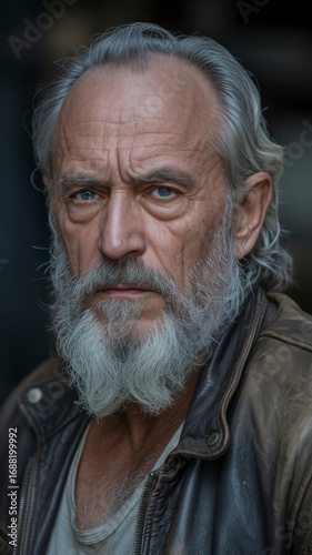 A close-up portrait of an older man with a rugged look, featuring a full beard and intense blue eyes, dressed in a leather jacket.