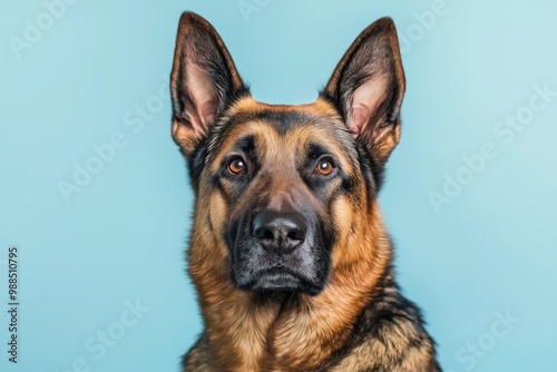 A close-up portrait photo of a cute Alsatian dog looking at the camera, isolated against a colourful background.