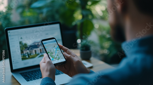 A close-up scene of a man holding a smartphone with an interactive map, next to his laptop showing beautiful home listings, capturing the convenience of online real estate tools.