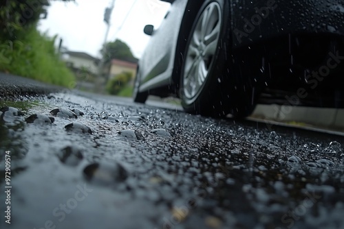 car, tire, road, water, rain, rainstorm, splash, safety, weather, wet, driving, closeup, vehicle, automotive, transportation, autumn, urban, street, modern, roadway, asphalt, wheel, travel