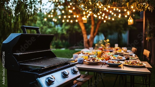 A close-up shot of a gas grill with a blurred background of a dinner table with food under a tree with string lights.