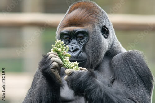 A close-up shot of a gorilla munching on some leaves, highlighting its natural behavior
