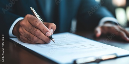 A close-up shot of a man in a suit attentively signing a document, emphasizing precision, responsibility, and the importance of formal agreements in a professional setting.