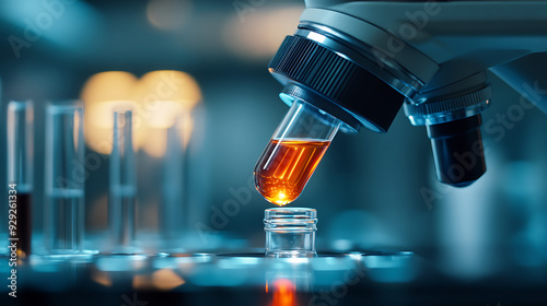 A close-up shot of a microscope examining a test tube containing a red liquid. The image highlights scientific research and laboratory analysis. AI generated