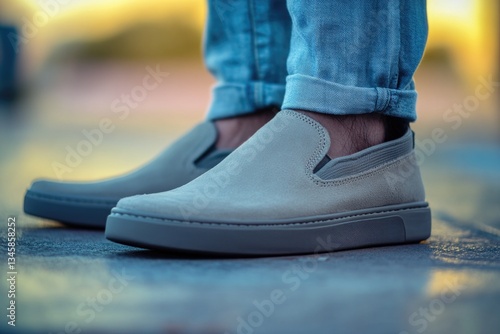 A close-up shot of a person's shoes on the ground, focusing on the details and texture