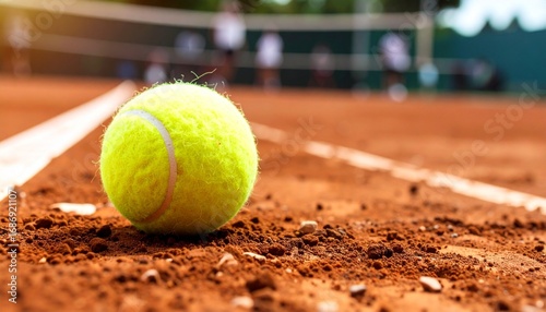 A close-up shot of a tennis ball resting on the court, with a net and players blurred in the background. The ball is in focus with the court, evoking a sense of anticipation and game play