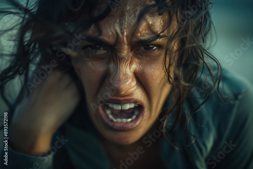 A close-up shot of a woman with wet, messy hair and a furious expression, shouting intensely, capturing a raw moment of anger and intensity.