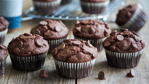 A close-up shot of assorted chocolate muffins with chocolate chips, placed on a table with a light background. The muffins have a rich texture and a delicious homemade appearance.