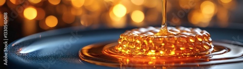 a close-up shot of honey with a honeycomb on a plate. The honey is flowing onto a plate in an artistic way.