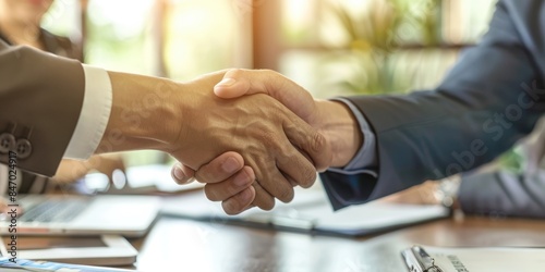 A close-up shot of two individuals shaking hands, conveying trust and agreement