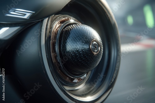 A close-up shot showcasing the intricate carbon fiber design and metallic accents of a futuristic race car wheel, highlighting the advanced engineering and aerodynamic details.