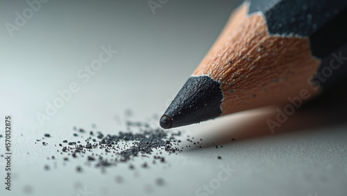 A close-up showcases a sharpened black pencil resting on white paper, surrounded by graphite dust, highlighting the tool's precision for drawing, sketching, and writing purposes.