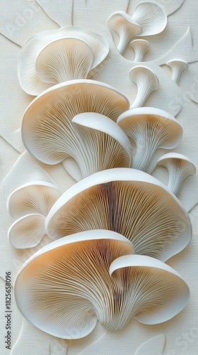 A close-up, vertical composition featuring a cluster of white oyster mushrooms with delicate gills, arranged on a textured, off-white surface. Soft, diffused na