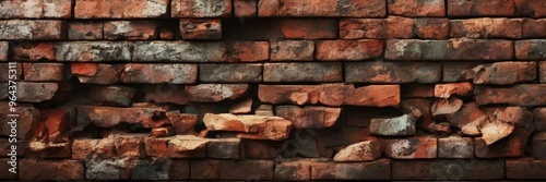 A close-up view of a brick wall with a mix of red, brown, and gray bricks, some of which are missing or broken.