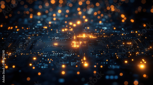 A close-up view of a circuit board with glowing orange lights, representing data flow or electronic activity, creating a visually striking and futuristic appearance