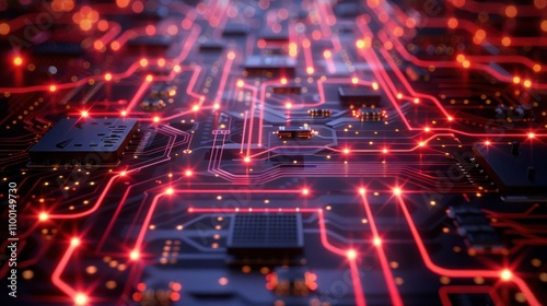 A close-up view of a circuit board with glowing pathways and electronic components.