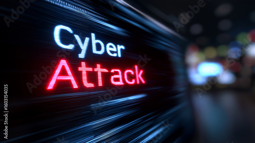 A close-up view of a digital screen displaying a prominent red "Cyber Attack" warning with abstract blue light streaks.