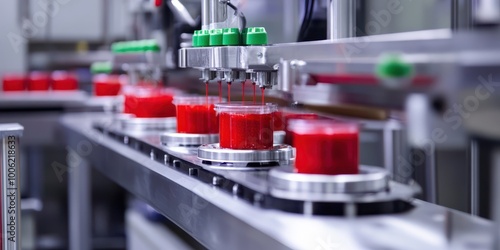 A close-up view of a modern industrial filling machine processing red containers on a production line.