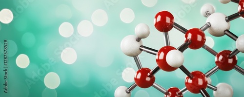 A close-up view of a molecular structure with red and white spheres on a soft, blurred teal background.