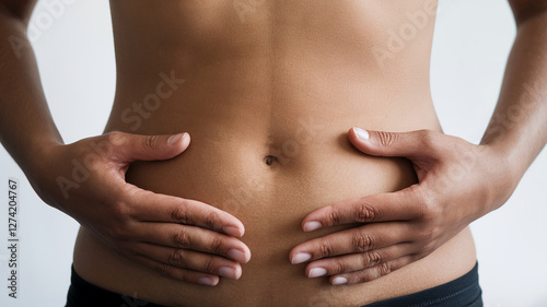 A close-up view of a person's torso with hands gently placed around the belly button, symbolizing calm, self-care, and connection to one's body.