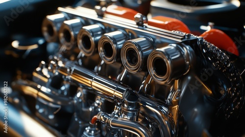 A close-up view of a polished engine component showcasing intricate metalwork and precision engineering.