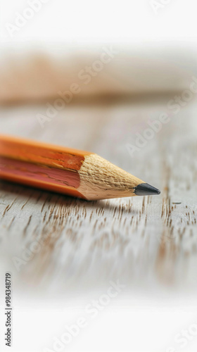 A close-up view of a sharpened pencil resting on a wooden table in a well-lit workspace