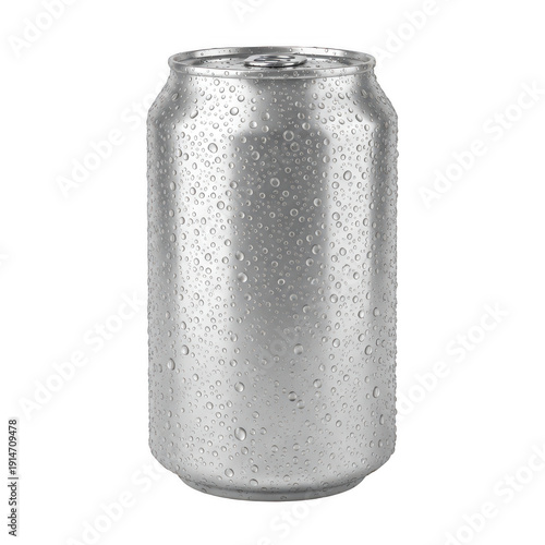 A close-up view of a shiny, unopened soda can with a silver background isolated on transparent background
