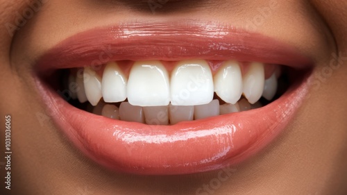A close-up view of a smiling woman showcasing bright white teeth and glossy lips