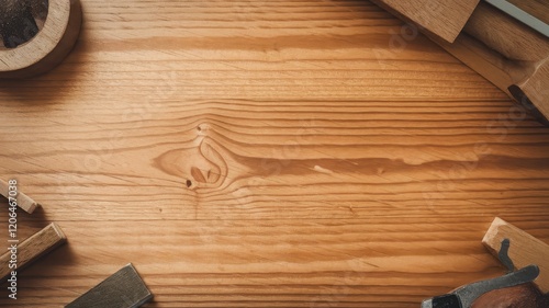A close-up view of a warm-toned wooden surface surrounded by various woodworking tools, creating a rustic and artistic ambiance.