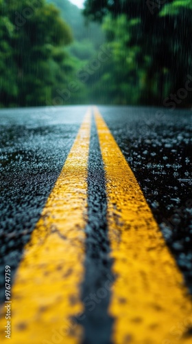 A close-up view of a wet road with yellow lines, surrounded by lush greenery on a rainy day, evoking a tranquil journey.