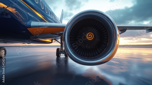 A close-up view of an aircraft engine at sunset, showcasing intricate details and reflecting light on a wet runway.