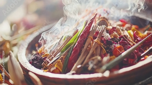 smoke, infuriated, bowl, burning, fragrant, herb, spice, ceremony, ritual, offering, aroma, colourful, warm, light, wood, stick, leaf, coloured, particle, texture, element, object, detail, close, up, natural, organic, heat, mixture, fire, dark, red, orange, yellow, green, brown, black, material, spiritual, practice, tradition, nature