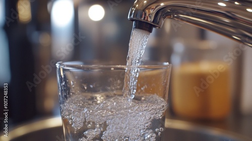 A close-up view of crystal-clear water flowing smoothly from a shiny metallic faucet into a transparent glass, capturing the purity and refreshing nature of drinking water.
