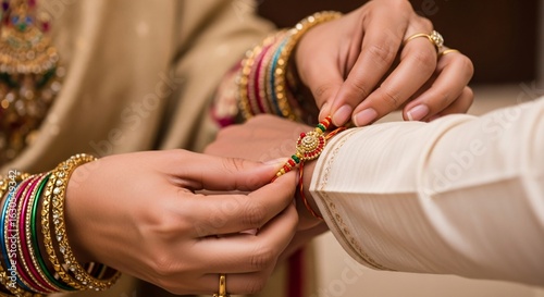 two people, one person, hand, adult, tying, wrist, bracelet, ceremony, cultural, celebration, ritual, tradition, bond, connection, family, love, respect, joy, happiness, ornate, intricate, colourful, gold, jewellery, bangle, ethnic, indoor, closeup, cropped, symbolic, vibrant, togetherness, human relationships, custom, auspicious, blessing, prosperity, thread, decorative, gift, textile, detailed, horizontal, warm tones