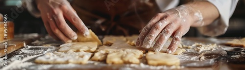 A close-up view of hands working with dough on a floured surface, showcasing the art of baking and preparation of cookies or pastries in a warm kitchen setting