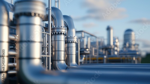 A close-up view of industrial pipes, showcasing metallic structures in a factory environment under a clear sky.