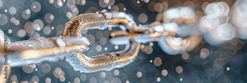 A close-up view of interconnected metal chains glistening with droplets of water, showcasing a blend of strength and beauty.