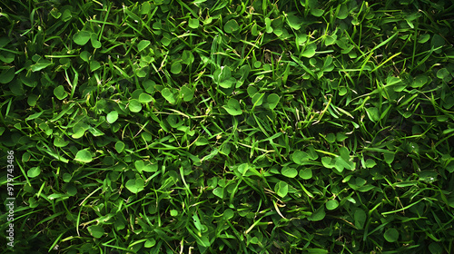 A Close-Up View of Lush Green Grass with Delicate Clover Leaves, Creating a Natural and Serene Background Texture