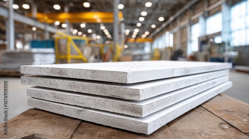 A close-up view of stacked concrete panels in a spacious industrial warehouse. The environment is bright and organized, showcasing construction materials.