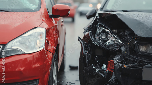 A close-up view of two cars after a collision, showcasing damage on a black vehicle alongside an undamaged red car, against a rainy urban backdrop.