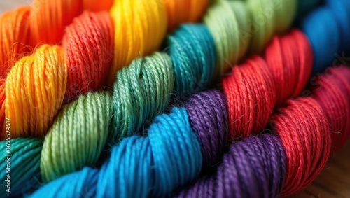 A close-up view of vibrant colorful yarn bundles, showcasing a spectrum of hues from rainbow colors.