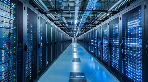 A cloud computing facility with servers, cooling systems, and energy-efficient design features.