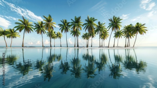 A cluster of coconut trees lining a tranquil tropical lagoon, their reflections shimmering in the crystal-clear water.