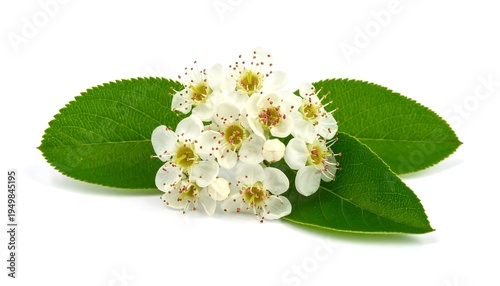 A cluster of delicate white blossoms with reddish centers, nestled between vibrant green leaves against a bright white background