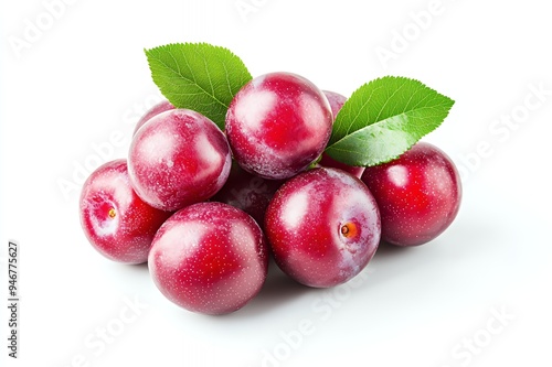 A cluster of fresh, shiny red plums with green leaves on a white background.