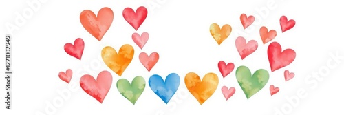 A cluster of small watercolor hearts in a harmonious arrangement on a white canvas, watercolor hearts, minimalist design, geometric pattern